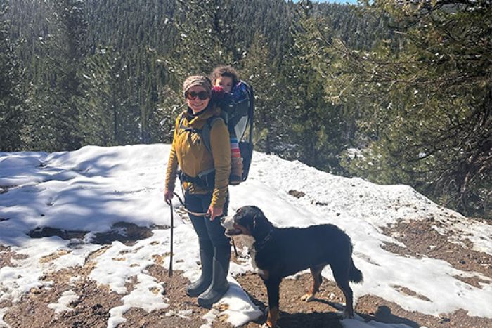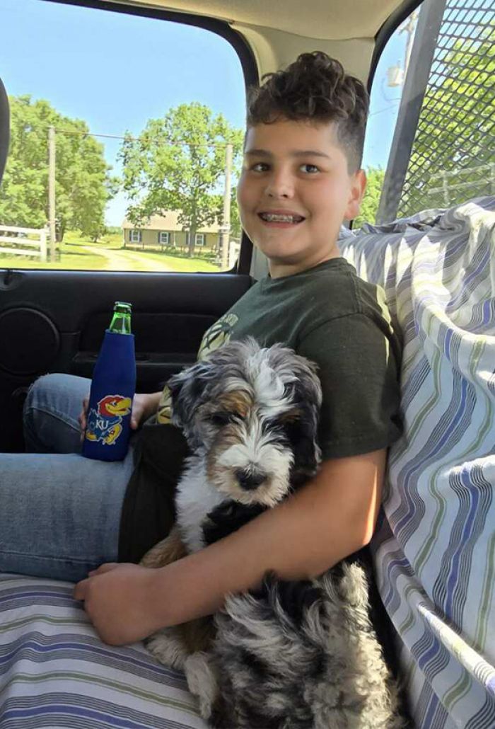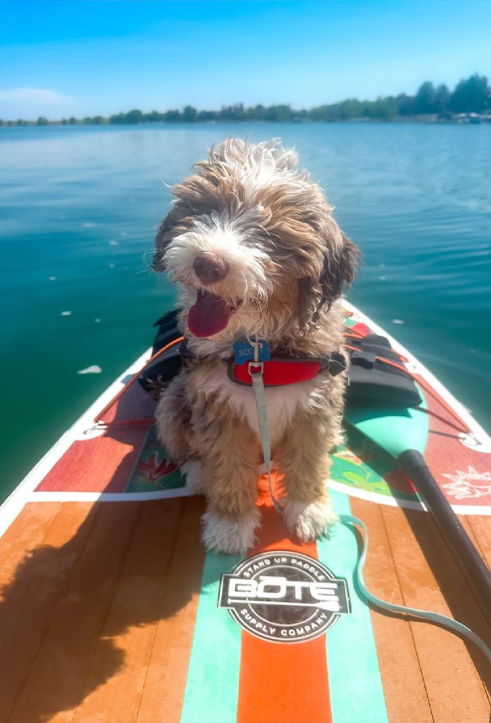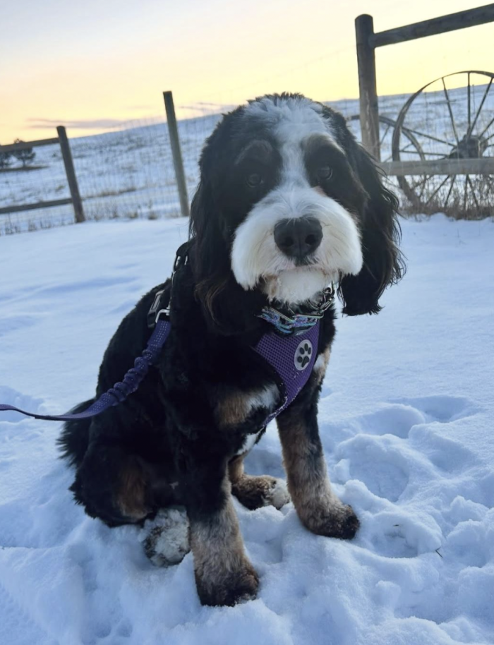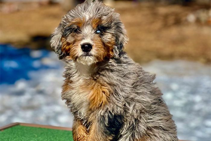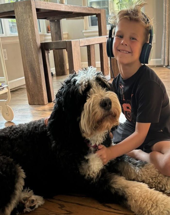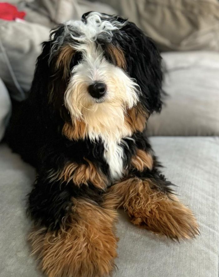 Cleo is our 30-pound mini F1 Bernedoodle mama. She is a sweetheart and loves kids! Very loyal, playful, and human focused. We absolutely adore her!