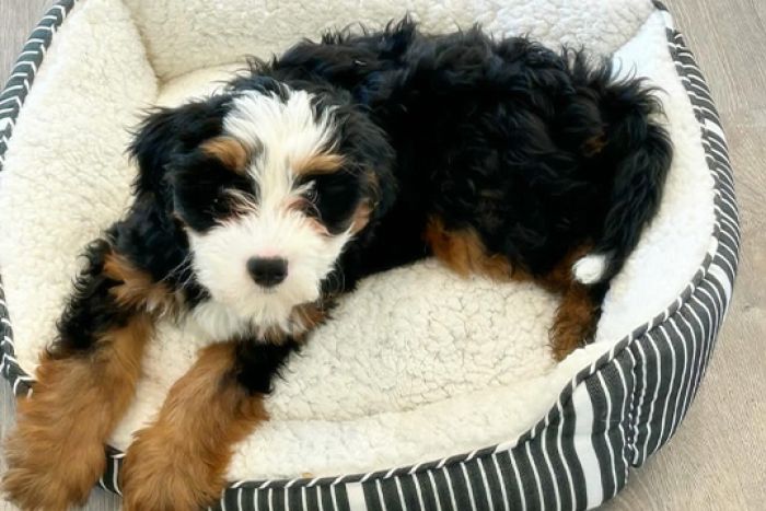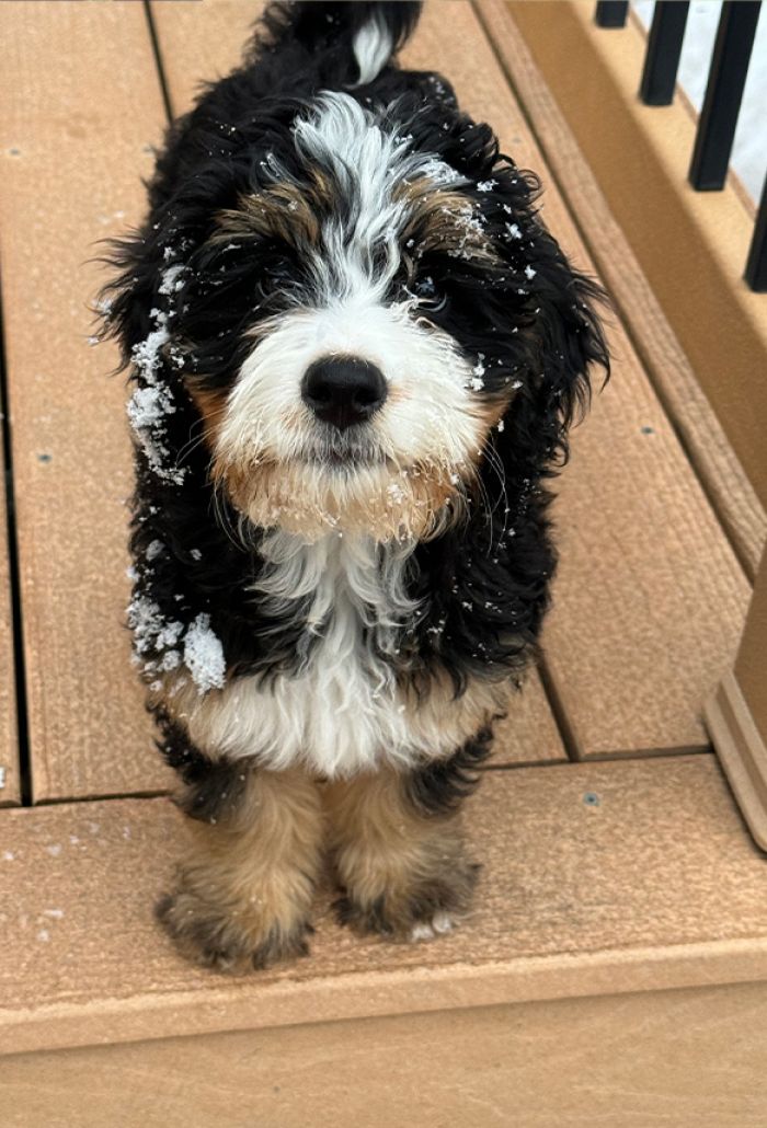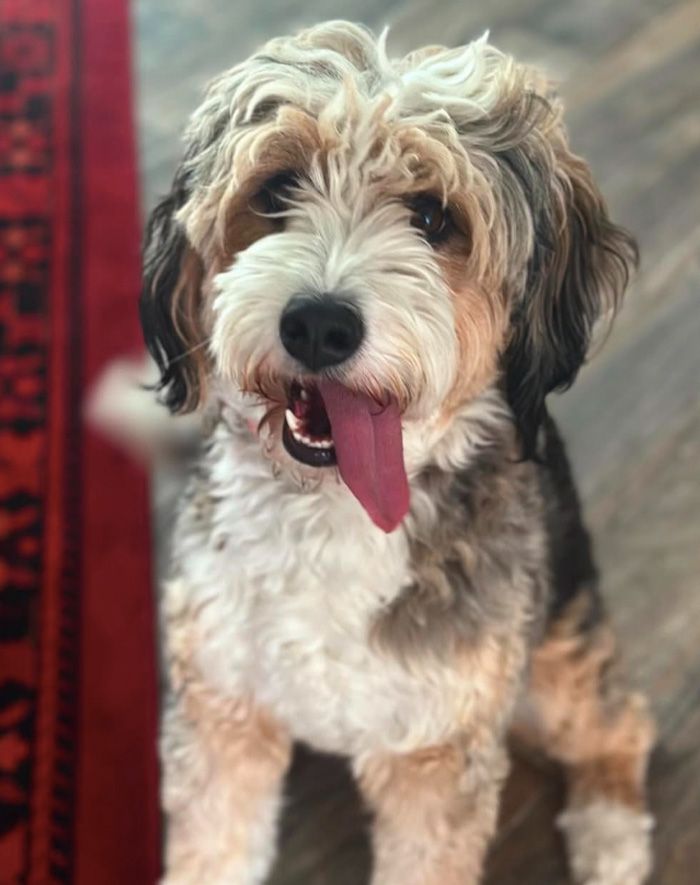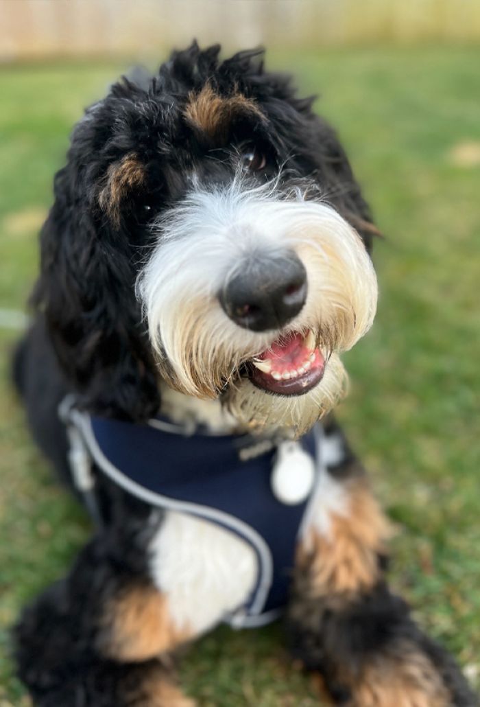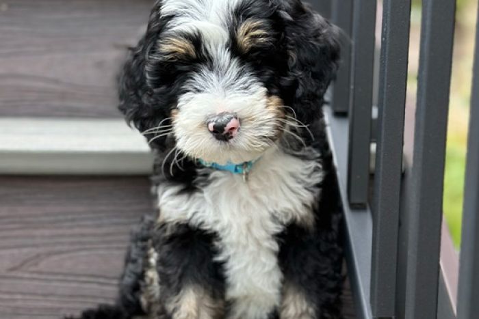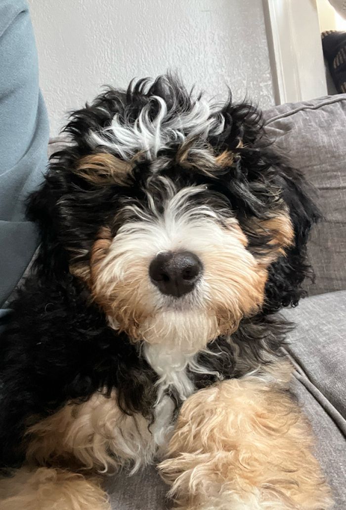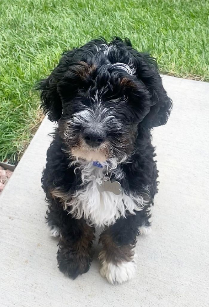 Bogey is an adorable 19-pound traditional tri mini Bernedoodle from Florida.