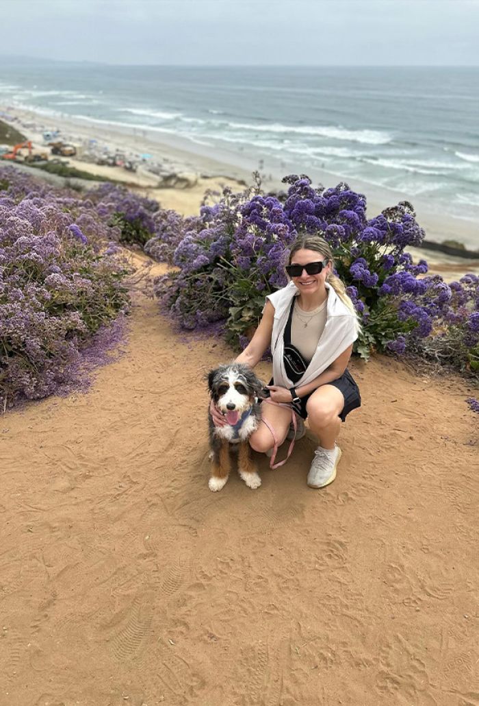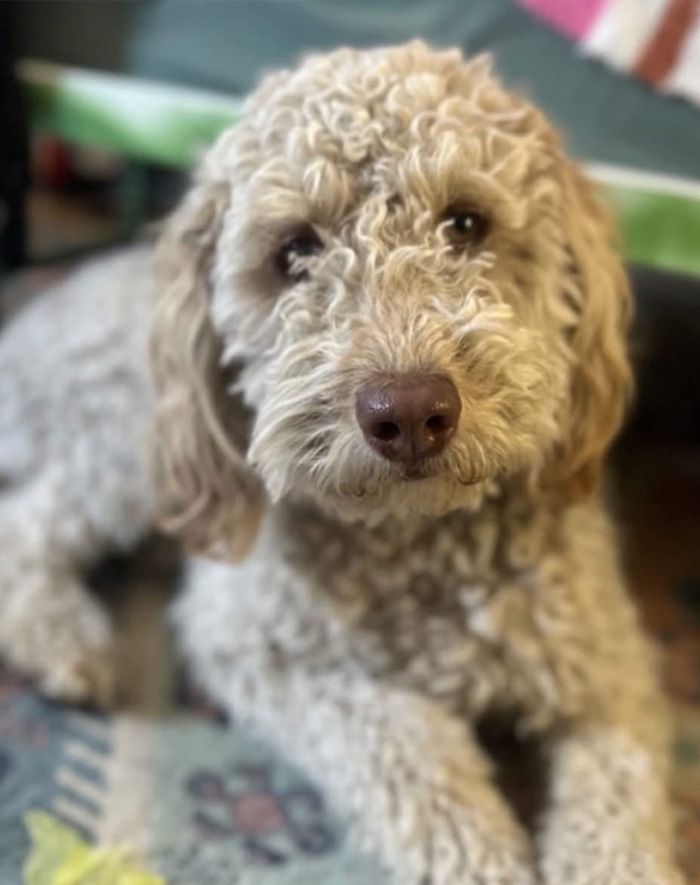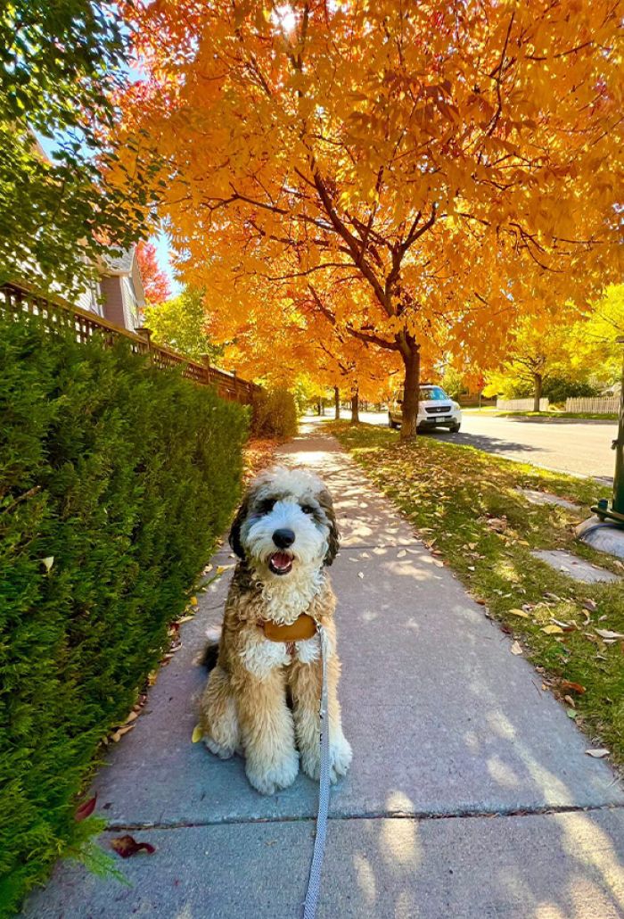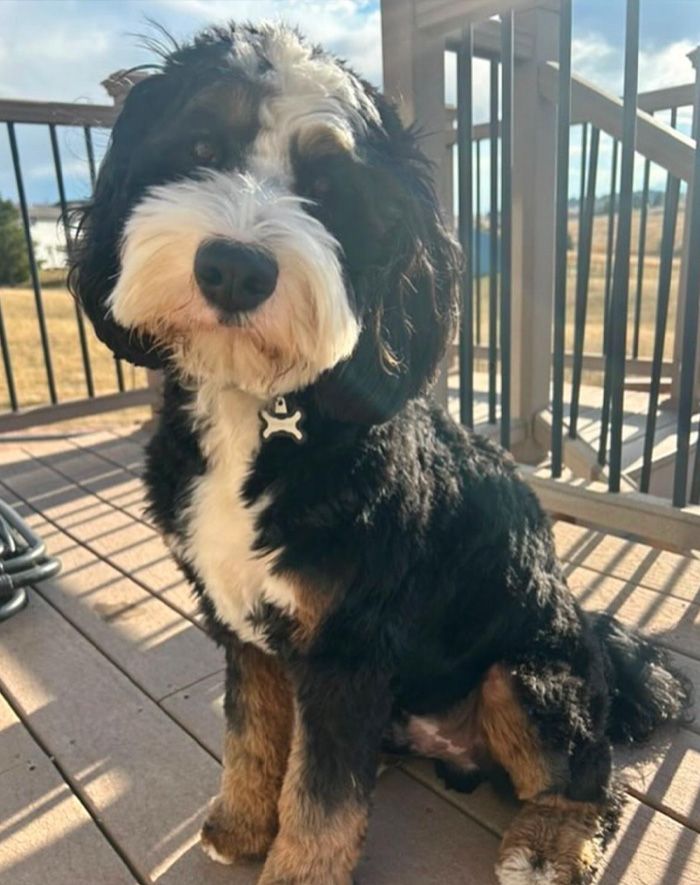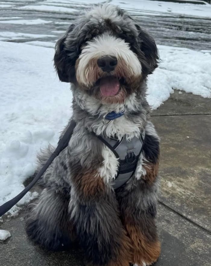 Sophie is our sweetheart Bernedoodle mama. She is a 40 pound F1b and carries for merle and chocolate. Sophie lives with my mom and is lower energy, and is very loyal. She loves belly rubs and is my mom’s constant shadow.
