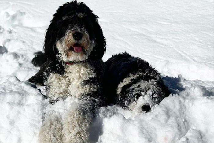 Willow is our big, 60-pound sweetheart, ultra Bernedoodle. She has her CGC certification and is a mellow, good-natured dog. This is her retirement litter, and her last two litters have been exceptional!
